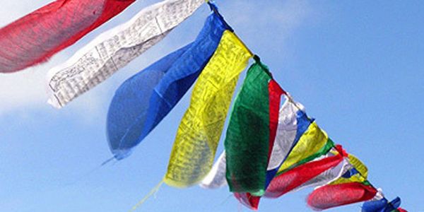 Tibetans have traditionally hung prayer flags for more than a thousand years. Written text, sacred symbols and pictures of Deities are displayed on the flags themselves, which can be seen near temples, sacred sites and peoples homes. The idea behind the flags is when the wind blows the prayers spread across the globe to bless all humankind on the planet. The traditional colours are red, yellow, green, blue and white - which represent the five elements the Tibetans believe our world consist of - Earth, Water, Fire, Air & Ether.